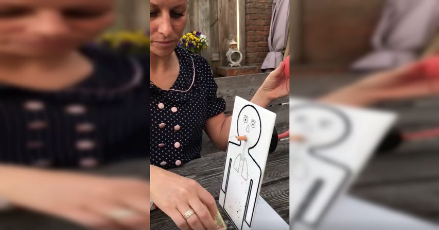 En el registro, se ve la maqueta de un muñeco fumando un cigarrillo con la ayuda del aire que bombea una chica. A modo de pulmones, el dibujo tiene una caja con algodón en su interior. Después de fumarse apenas un cigarro, la conclusión es clara: el material ya no es blanco, sino marrón.