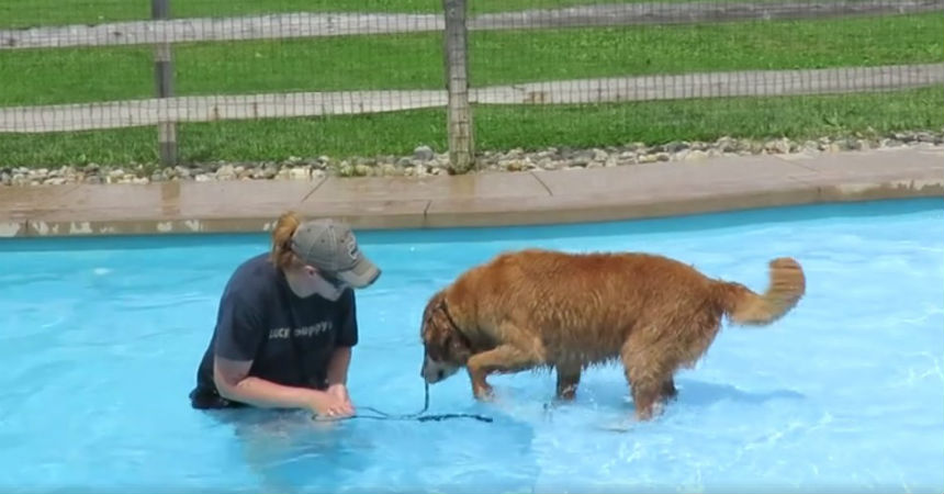 Buddy ha estado desde que es un cachorro en una guardería canina en Maybee, Míchigan, pero en sus nueve años de vida nunca se había atrevido a nadar. Eso hasta que su cuidadora Kristina, lo alienta para que se olvide de sus temores y salte al agua.