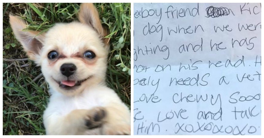 "Hola, soy Chewy, mi dueño estaba en una relación abusiva y no podía permitirse el lujo de llevarme en el vuelo. Ella con todo su corazón deseaba no dejarme aquí, pero no tiene otra opción. Mi exnovio le dio patadas a mi perro cuando estábamos discutiendo y tiene un gran nudo en la cabeza. Probablemente necesite un veterinario. Amo demasiado a Chewy. Por favor ámenlo y cuídenlo", son las palabras con las que la antigua dueña del can se despidió de su pequeño compañero.