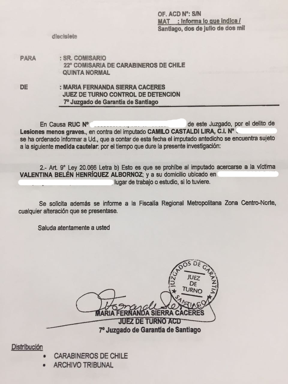 Además, el 7° Juzgado de Garantía de Santiago emitió un fallo en el que se le prohibe a Castaldi el acercarse a la víctima en su casa, lugar de trabajo o estudio, según publicó CNN Chile.