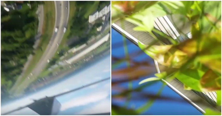 En las imágenes se ve cómo el teléfono se aleja de la avioneta y empieza a girar sin control antes de caer al suelo, terminando entre un montón de hojas. Posteriormente, aparece un hombre sin camisa que está pasando una cortadora de pasto muy cerca del Samsung Galaxy S5.