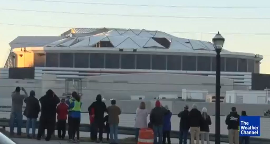I am CRYING. The Weather Channel set up for a live shot of the Georgia Dome being imploded, and at the perfectly wrong time ... this happened (via @ajc): pic.twitter.com/LA0cXpC7oX
