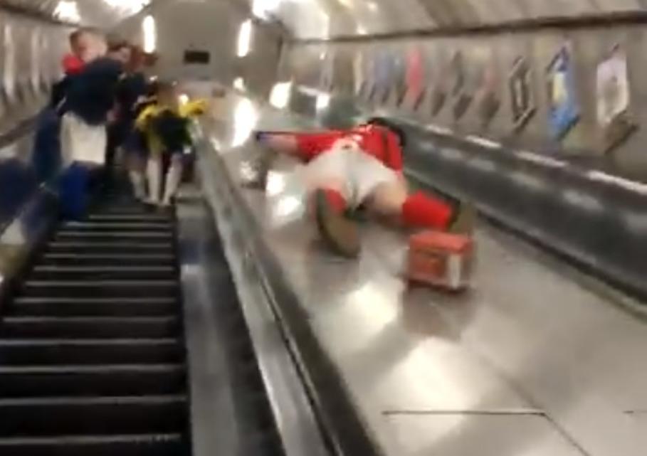 Después de una noche de fiesta, este muchacho intentó realizar un arriesgado acto para que quedara grabado en el celular de un amigo: Deslizarse por la parte central de una escalera mecánica.