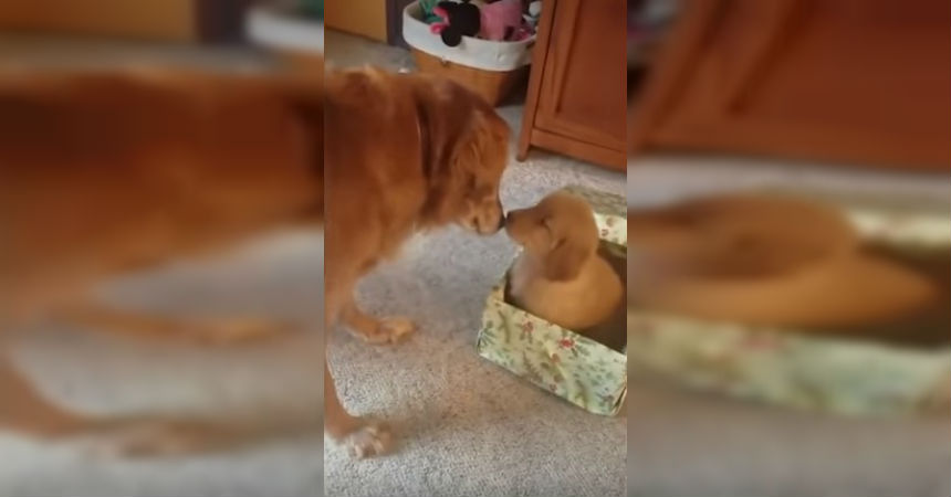 Cash es un golden retriever que llevaba tres años solo tras el fallecimiento de su pareja Rosie. Como una forma de alegrarle la vida, Marie Ahonen y su esposo quisieron sorprenderlo con un curioso regalo de Navidad: un tierno cachorro