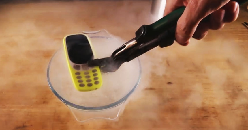 Para eso sumergieron el nuevo modelo 3310 en un recipiente con nitrógeno líquido. El nitrógeno puede alcanzar temperatura de -195,8° celsius, por lo que el teléfono quedará congelado en cosa de segundos.