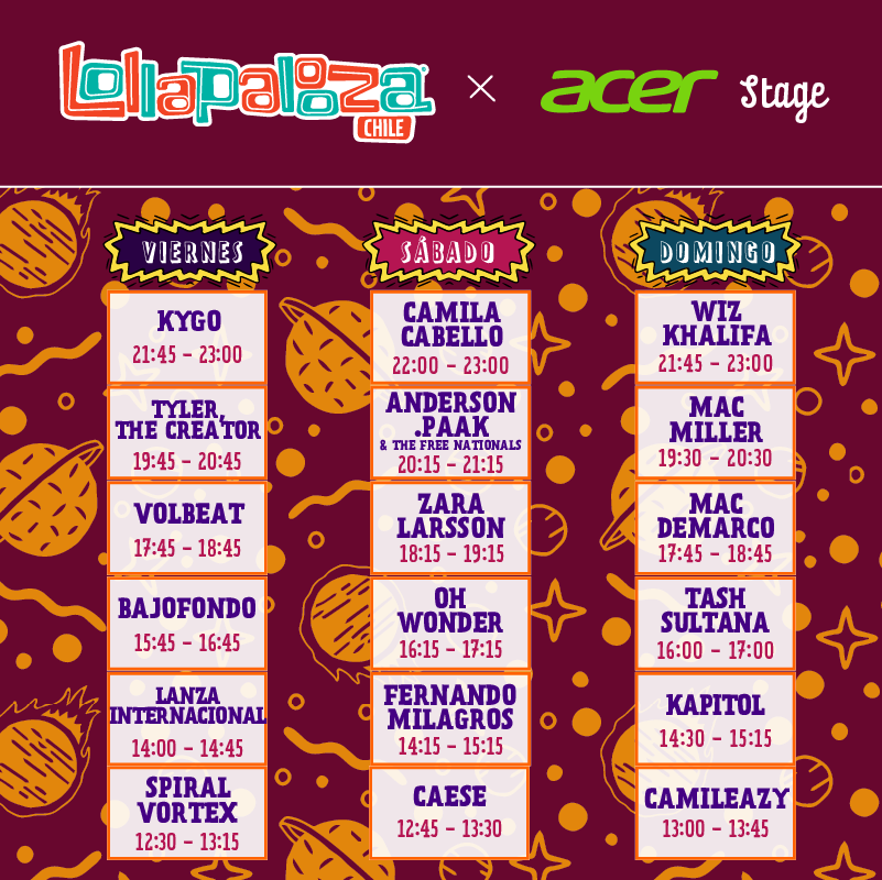 En el escenario Acer Stage se encontrará una sorprendente colección de estilos y sonidos. Desde Spiral Vortex y los recién agregados Lanza Internacional, a la cercanía de Bajofondo y luego el metal europeo de Volbeat, para cerrar con Tyler, The Creator y Kygo.