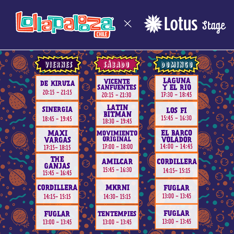 Por otro lado, con el Lotus Stage instalado por primera vez al aire libre, el viernes 16 de marzo, los fans chilenos podrán disfrutar de los clásicos de Sinergia y De Kiruza, además de Cordillera, Maxi Vargas, Tha Ganjas, Fuglar, Sinergia, Movimiento Original y Quique Neira.