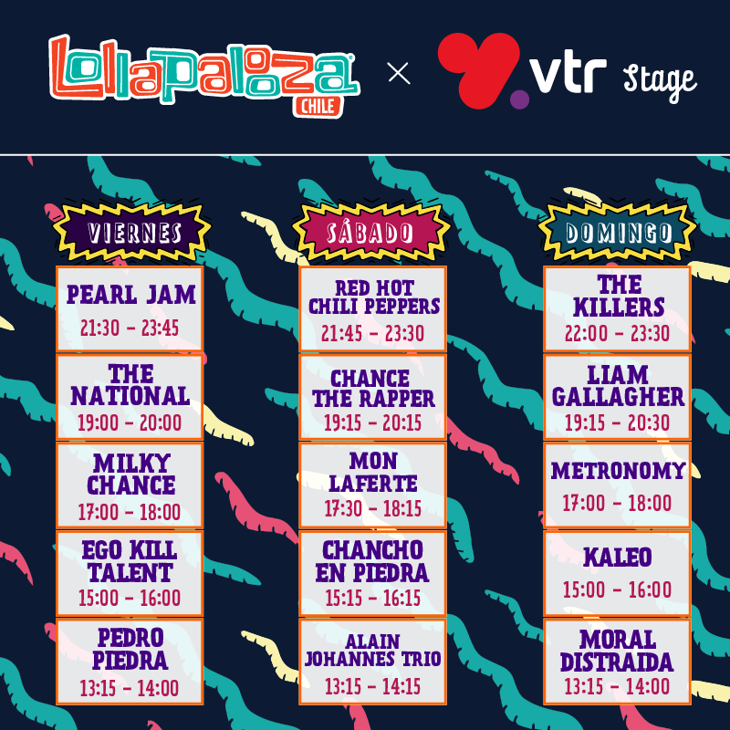 Por eso, acá te dejamos los horarios de las más de cien presentaciones que se llevarán a cabo en el Parque O'Higgins, y que tiene como principales protagonistas a Pearl Jam, Red Hot Chili Peppers y The Killers, quienes serán los encargados de cerrar cada una de las jornadas del festival.