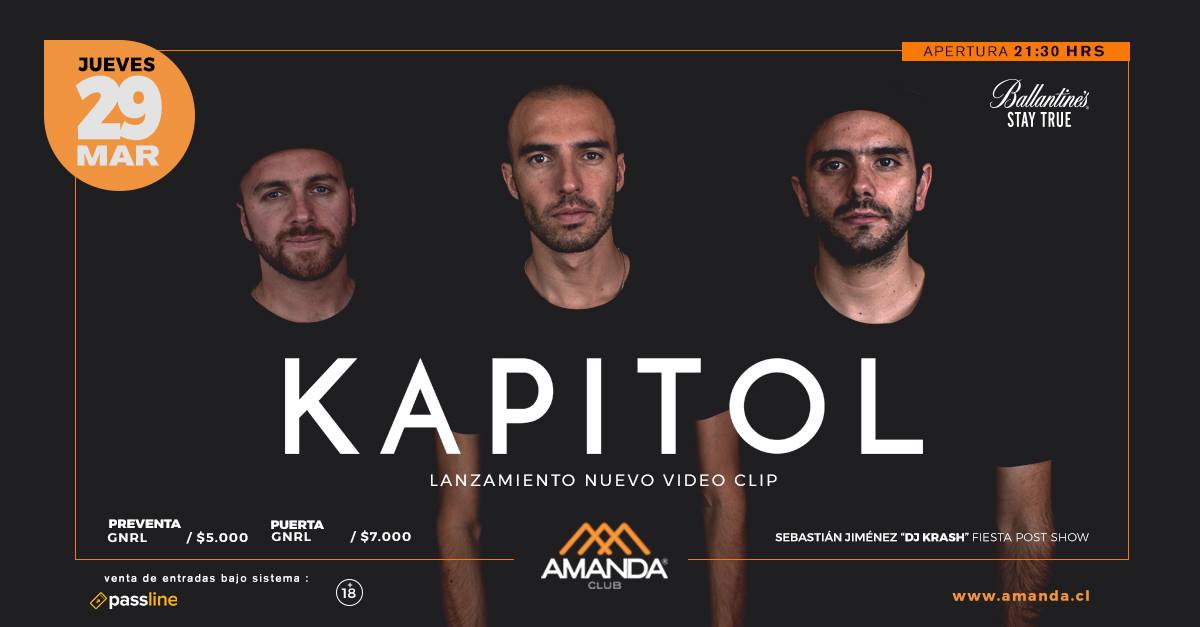 El trío chileno de rock pop formado a finales del 2011 Kapitol, se presentará este jueves 29 de marzo en Club Amanda para darle la bienvenida a Abril en compañía de sus fans.
