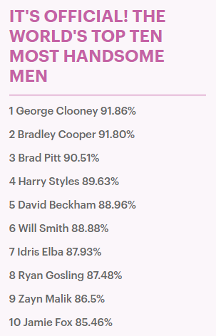 Así entonces, da Silva unió la proporción planteada por Da Vinci con la imagen de varias celebridades reconocidas a nivel mundial y concluyó que el hombre más atractivo del mundo es George Clooney, acompañado por, Bradley Cooper y Brad Pitt.