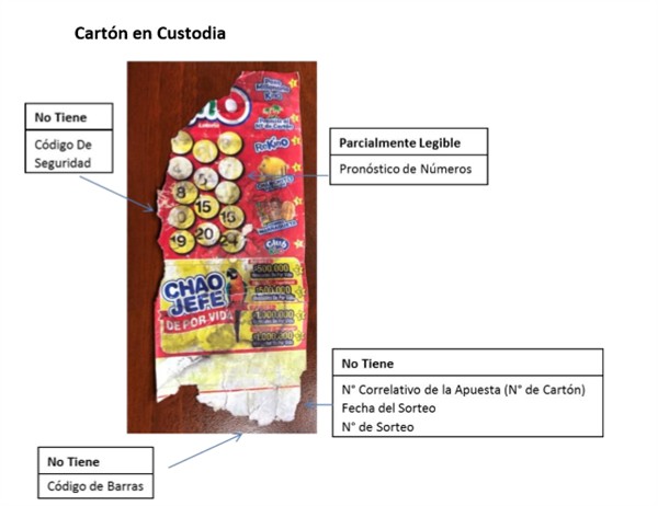 Esta semana, el asesor jurídico de Lotería de Concepción confirmó que el cartón presentado por Javier Zapata "no cuenta con los mecanismos de seguridad" exigidos por las bases del concurso, por lo que no se podrá pagar. El cartón fue presentado días después del sorteo con un notorio deterioro: sin su esquina izquierda y con varios números desteñidos por contacto con líquido.