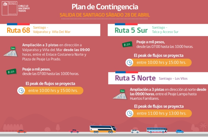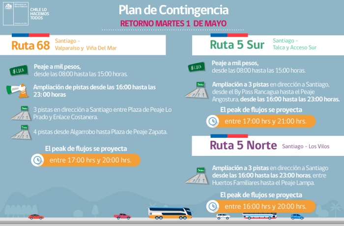 Entre las medidas que trae el plan de contingencia para mitigar las salidas y regresos de los más de 367 mil vehículos que circularán por las carreteras del país, está la ampliación de pistas, el refuerzo de peajistas, peajes a mil pesos e información constante a través de la página www.mop.cl y de las redes sociales del MOP.