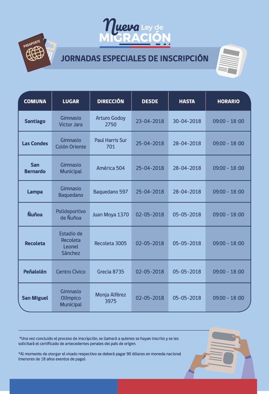 Los inmigrantes que ingresaron a Chile a través de pasos no autorizados tienen un plazo de 30 días para realizar el trámite. Aquellos que tienen permisos de turismo o visas vencidas o realicen actividades remuneradas sin autorización, tienen un plazo de 90 días.