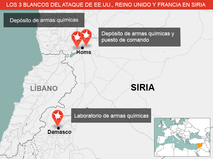 Washington y sus aliados europeos señalaron que los ataques fueron dirigidos a instalaciones asociadas al programa de armamento químico de Damasco. La operación consistió en bombardeos aéreos y de misiles, proyectados desde buques en el Mediterráneo.