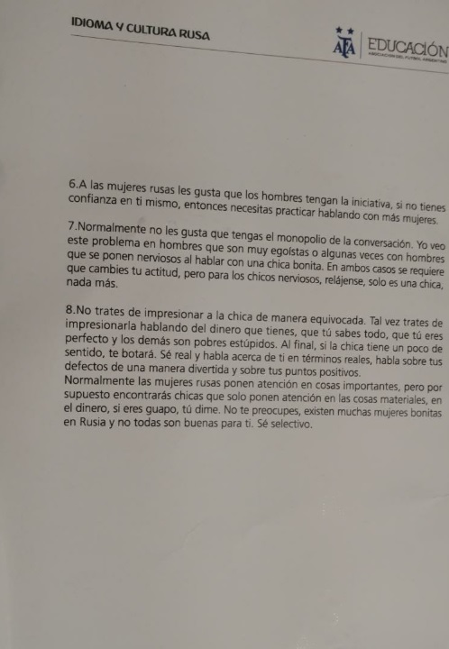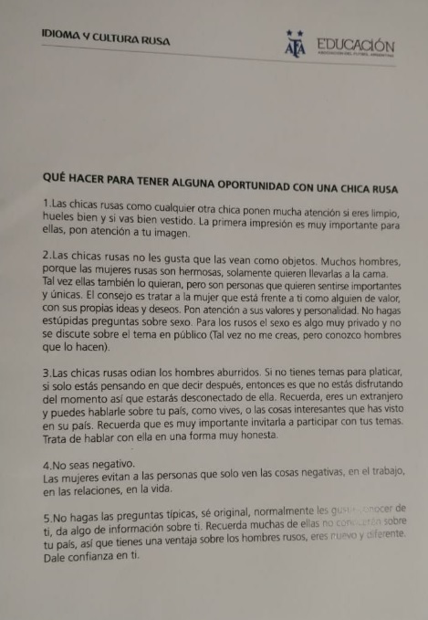 Había dos páginas del manual “Idioma y Cultura Rusa” que contenían consejos para seducir mujeres del país anfitrión. El periodista Nacho Catullo, lo subió a Twitter y la información se viralizó rápidamente.