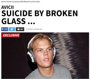 Según fuentes cercanas al círculo del artista, Avicii se habría suicidado con una botella rota. Dichos testimonios, sin embargo, no son coherentes a la hora de afirmar la zona agredida (una fuente menciona el cuello y otra las muñecas). Lo que los testimonios sí dan por hecho es que esos cortes generaron una hemorragia que finalmente acabó con la vida del músico.