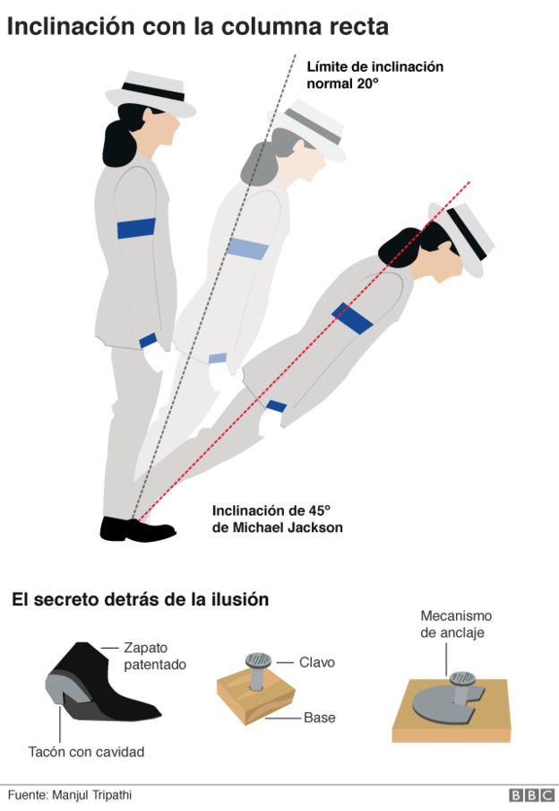 Un ejemplo de esto es uno de los movimientos que hacía en el video "Smooth Criminal", de 1987. Se trata del momento en el que Michael Jackson inclina su cuerpo en una línea completamente recta, a un ángulo de 45º, y logra no caerse al suelo.