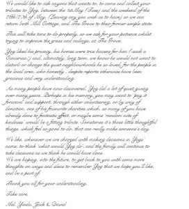A través de la carta la familia aseguró que “a Yog (como le dicen a George) le gustaba la privacidad, sus casas eran verdaderos refugios para él (¡típico Cáncer!)”, agregando que no le hubiese gustado nada “molestar o romper la quietud de los vecinos que tanto apreciaba”.