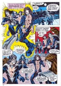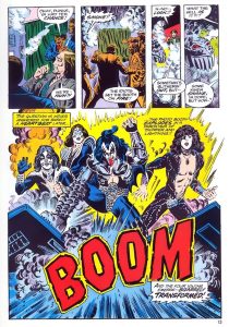 La portada además, la dibujó el gran Gray Morrow (Capitán América). Y sin duda, una de las características que más llamó la atención es que en ella, se puede leer “Printed in real Kiss blood”, es decir: la tinta que utilizaron para colorear la tapa del comic tenía auténtica y real sangre de los integrantes de la banda neoyorkina. Para no creerlo.