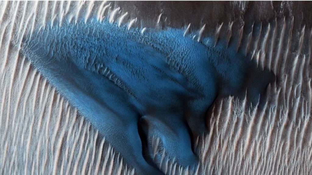 En un descubrimiento que se llevó a cabo en enero, los orbitadores de la organización especial descubrieron una deslumbrante formación de color: una duna azulada en el cráter Lyot de Marte.