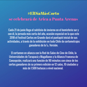Cada 21 de junio llega el solsticio de invierno en el hemisferio sur y con él, el día más corto del año. A propósito de esta ocasión, es que el Festival Cortos en Grande decidió comenzar su edición 2018 ese mismo día.