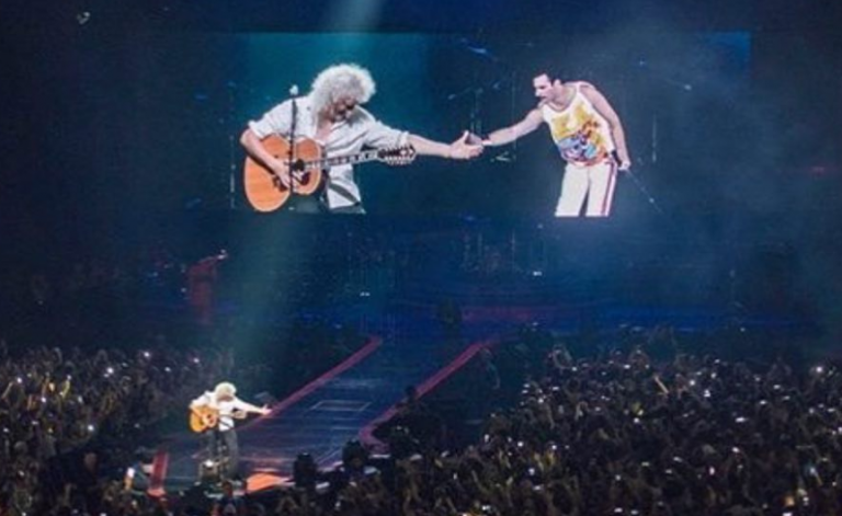 "¡Contactos a través de los años! Esta es una de mis fotos favoritas de la gira que acabamos de completar. Por supuesto que he ensayado con Freddie, pero es impredecible, diferente cada noche dependiendo de la geometría del lugar, y sujeto al hecho de que no puedo ver la imagen de la pantalla de Freddie en este momento. Pero en esta noche en particular ... ¡evidentemente la magia sucedió! Foto de Ric Lipson: nuestro genio diseñador de @stufishstudio. Y gracias a todos ustedes que cantaron conmigo y lo hicieron posible. Bri", fueron las palabras del músico en su cuenta de Instagram.