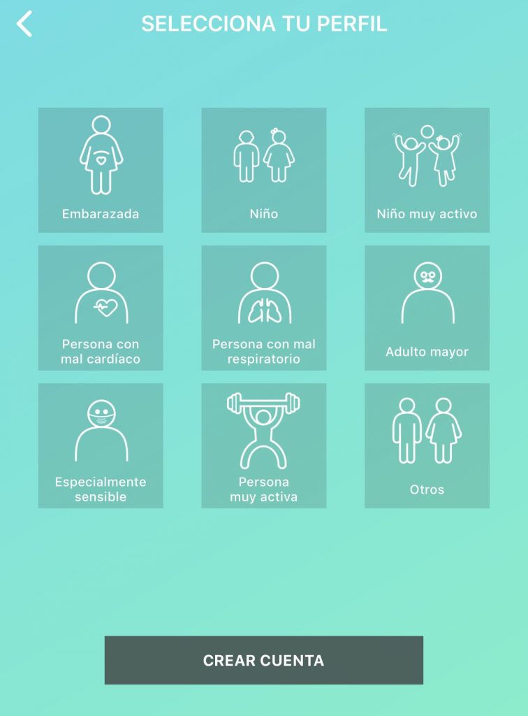 Al descargar la aplicación, debes registrarte y escoger el tipo de perfil que te acomode: deportista, una mujer embarazada, de la tercera edad, si tienes algún problema cardíaco/respiratorio, niño, persona especialmente sensible u otros.