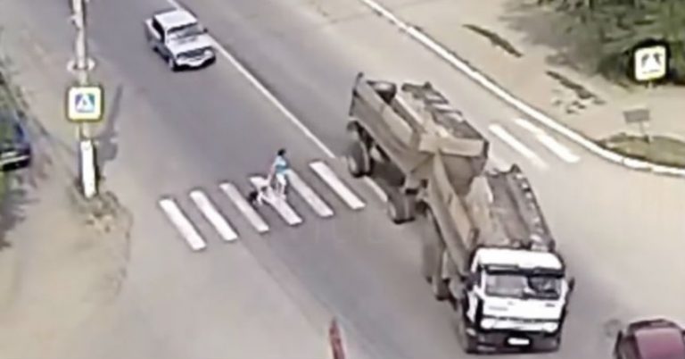 En el video se puede ver a un perro cruzando un paso de cebra junto a su dueña que camina totalmente distraída. En ese momento, un camión se acerca a toda velocidad sin tiempo para poder pisar el freno y parar. El perro se da cuenta de la velocidad del camión y para en seco, tirando de la correa para que su dueña también pare de caminar.