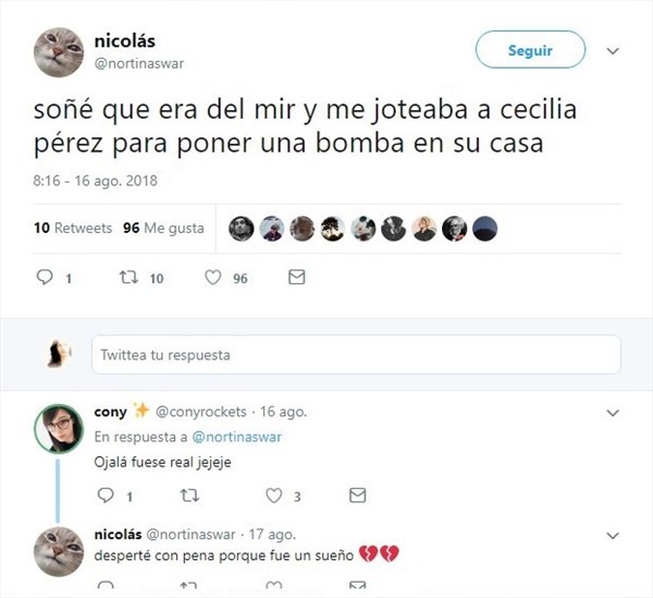 El tweet mencionaba: “Soñé que era del MIR y me joteaba a Cecilia Pérez para poner una bomba en su casa”. El mensaje posteriormente fue eliminado de su cuenta.