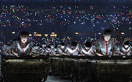 Después de una muestra de danza contemporánea, al Estadio Nacional de Pekín, conocido comúnmente como "Nido de pájaros", ingresaron 2.008 percusionistas de fou, quienes realizaron una presentación sincronizada utilizando solo este instrumento.