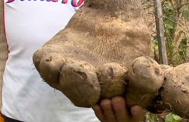 El tubérculo pesa nada menos que ocho kilos y tiene una "monstruosa" forma de un gigante pie humano, con lo que vendrían siendo 6 dedos. Aunque no saben si la van a comer, les llama la atención la idea de mostrarlo al mundo.