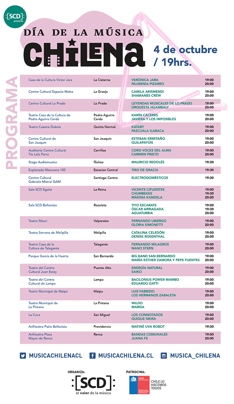 Como ya es tradición, la Sociedad Chilena de Autores e Intérpretes Musicales (SCD) hace coincidir la fecha para celebrar cada año el Día de la Música Chilena, junto con varios conciertos gratuitos.