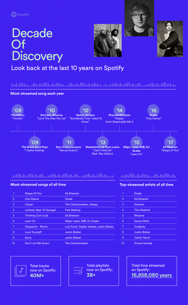 La plataforma ademas, realizó una lista de los sencillos más reproducidos por cada año. Donde aparecen artistas como The Killers, Gotye y Kimbra, Major Lazer, MØ y DJ Snake.