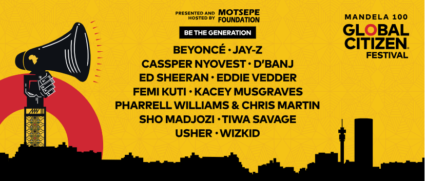 Bajo el nombre 'Global Citizen: Mandela 100', tanto Los Unidades (Coldplay) como otros artistas formarán parte del festival que será llevado a cabo por la organización Global Citizen en el FNB Stadium de Johannesburgo este domingo 2 de diciembre. El encuentro formará parte de un homenaje a Mandela y contará con las actuaciones de Beyoncé, JAY-Z, Kacey Musgraves, Ed Sheeran, Eddie Vedder, Usher, Pharrel Williams y Chris Martin, entre otros.