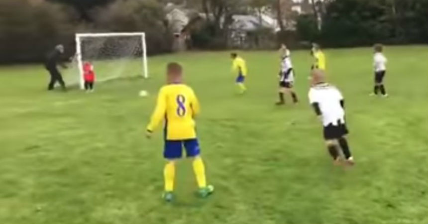 El sujeto ya ha sido calificado como "el padre del año" por su actitud. En las imágenes se ve al papá del niño arquero, del equipo Sub 8 de Bow Street FC, que participa en la liga del centro de Gales. El rival remata al arco y el niño distraído no atiende el remate hasta que su padre literalmente lo lanza sobre el suelo para rechazar el balón.