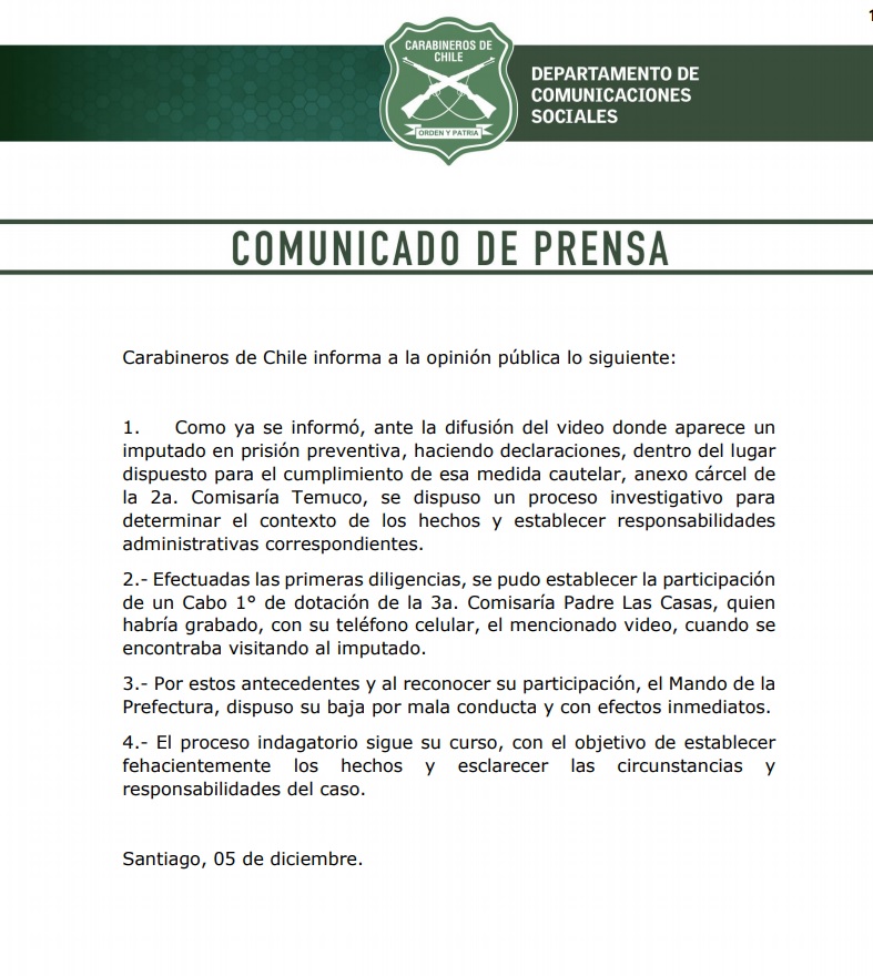 “Se pudo establecer la participación de un cabo 1° de dotación de la 3° comisaría Padre Las Casas, quien habría grabado, con su teléfono celular, el mencionado video, cuando se encontraba visitando al imputado”, señalaron.