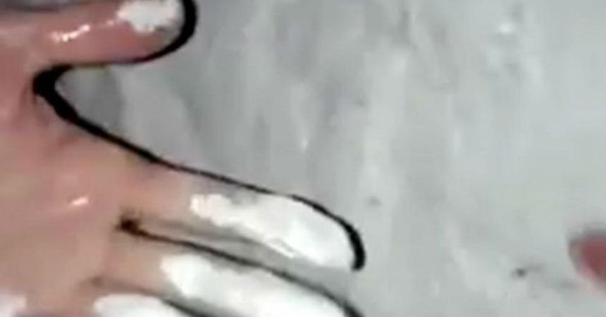 La mano de una mujer sosteniendo un poco de nieve en una zona de juego infantil demuestra que ésta había sido coloreada de forma artificial ya que su piel queda teñida de blanco.