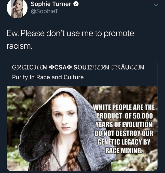 ¿Qué tal? A Sophie Turner no le gustó para nada, lo que la motivó a hacer el siguiente llamado: "Por favor, no me usen para promover el racismo".