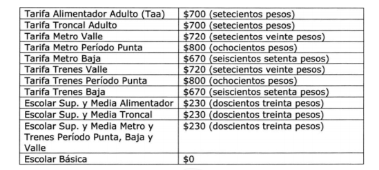 Los valores de las nuevas tarifas muestran que el pasaje adulto para buses corresponde a $700, mientras que en el caso del Metro el horario bajo es de $670, el valle $720 y el punta $800. En el caso de los escolares, el valor es de $230 para todos los servicios.