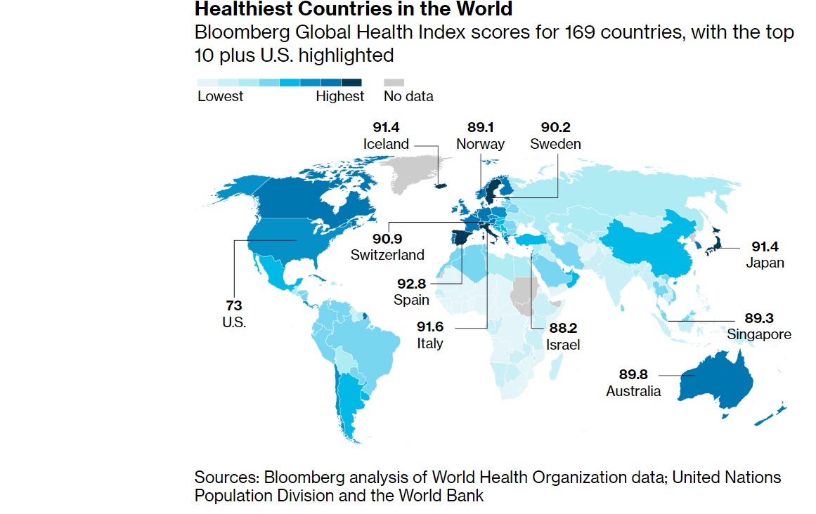 Chile es el país más saludable de Sudamérica, el segundo a nivel latinoamericano después de Cuba y el número 33 en el mundo. Así lo reveló el estudio realizado por Bloomberg Healthiest Country Index, que analizó los factores que influyen en la calidad de vida de las personas de 169 países, como por ejemplo: hábitos alimenticios, sistema sanitario, esperanza de vida, tabaquismo, obesidad o medio ambiente.