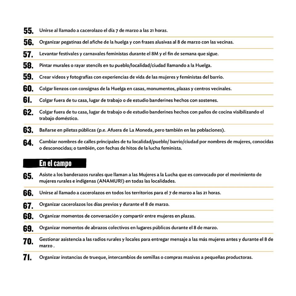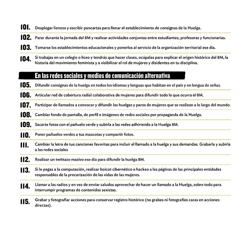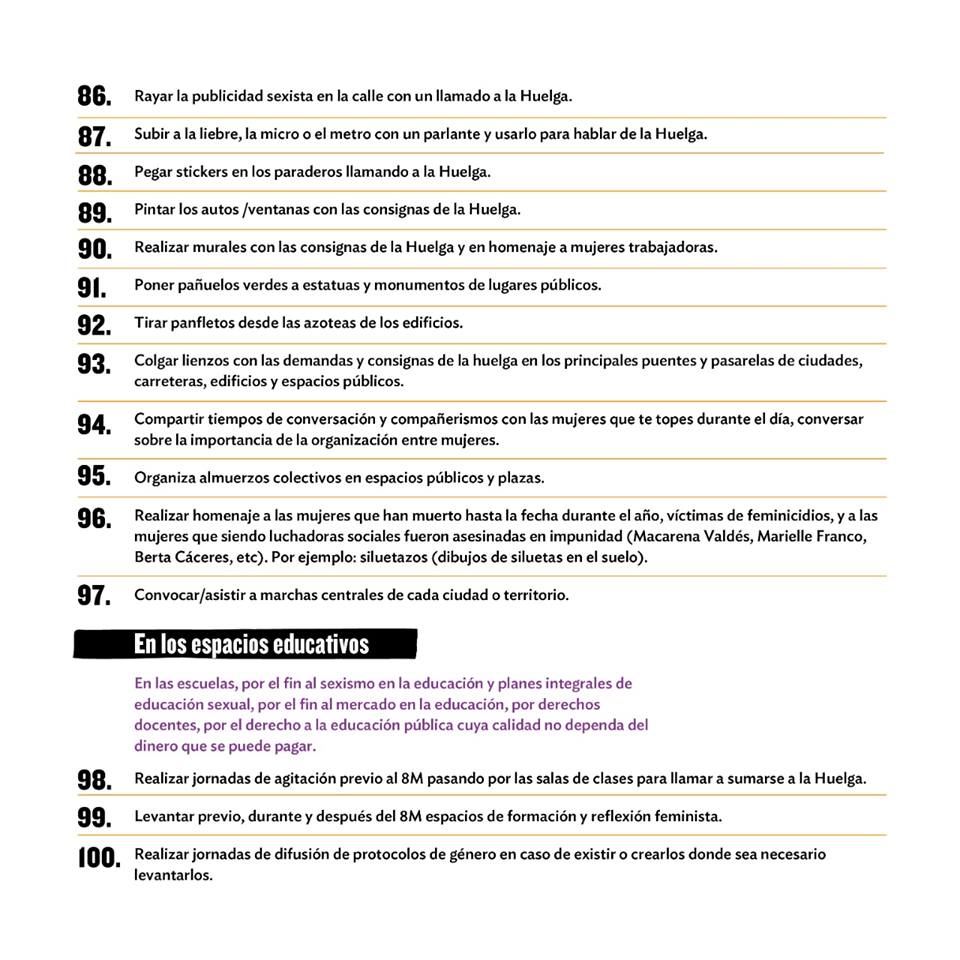 Enumeradas del 1 hasta el 121, la organización propone distintas alternativas para visibilizar el apoyo al movimiento feminista actual. Desde generar instancias de conversación en espacios públicos, laborales y del hogar, hasta lucir una cinta violeta en la muñeca, sumarse al cacelorazo del 7 de marzo a las 21 hrs., y encargar a los hombres de familia las tareas del hogar para el 8M.