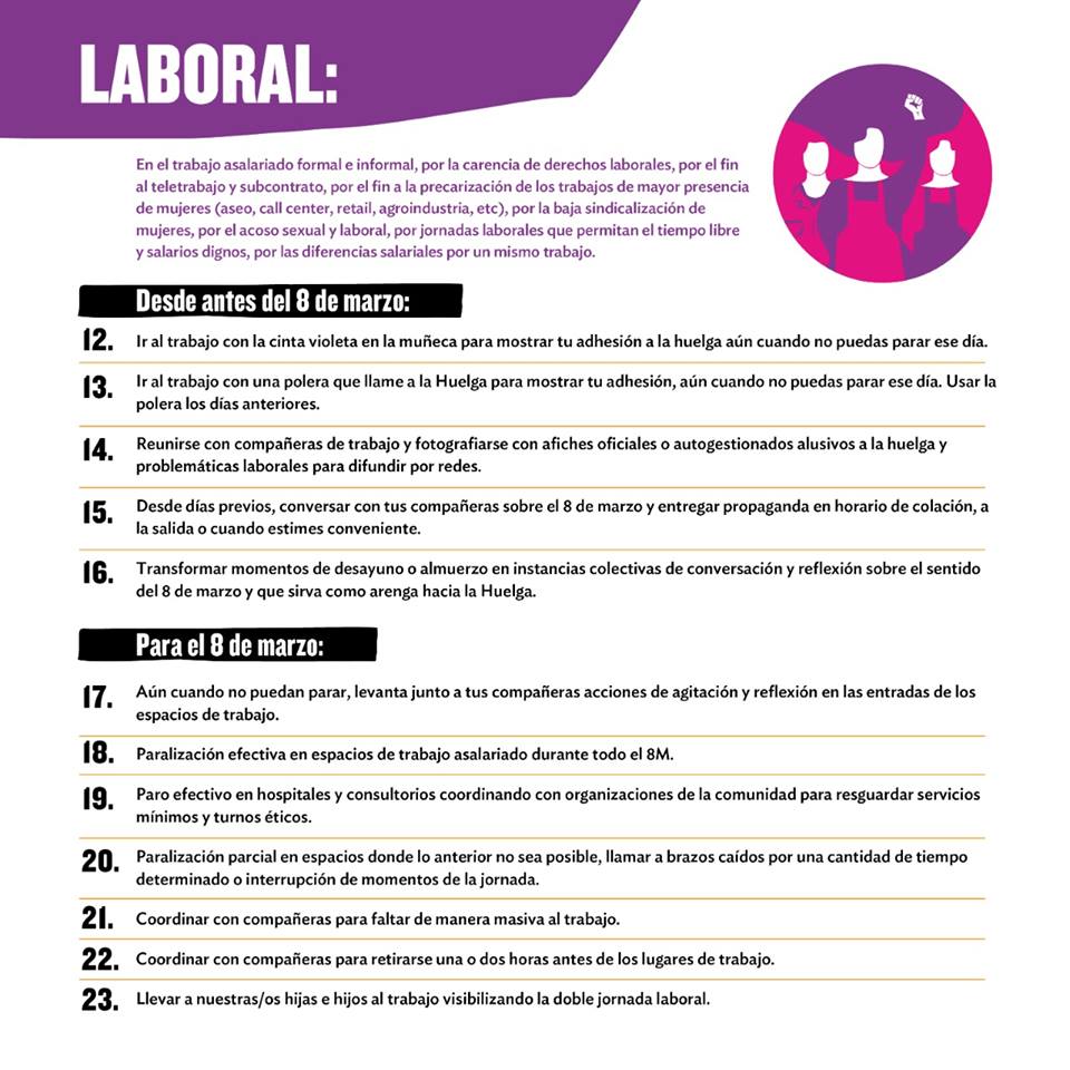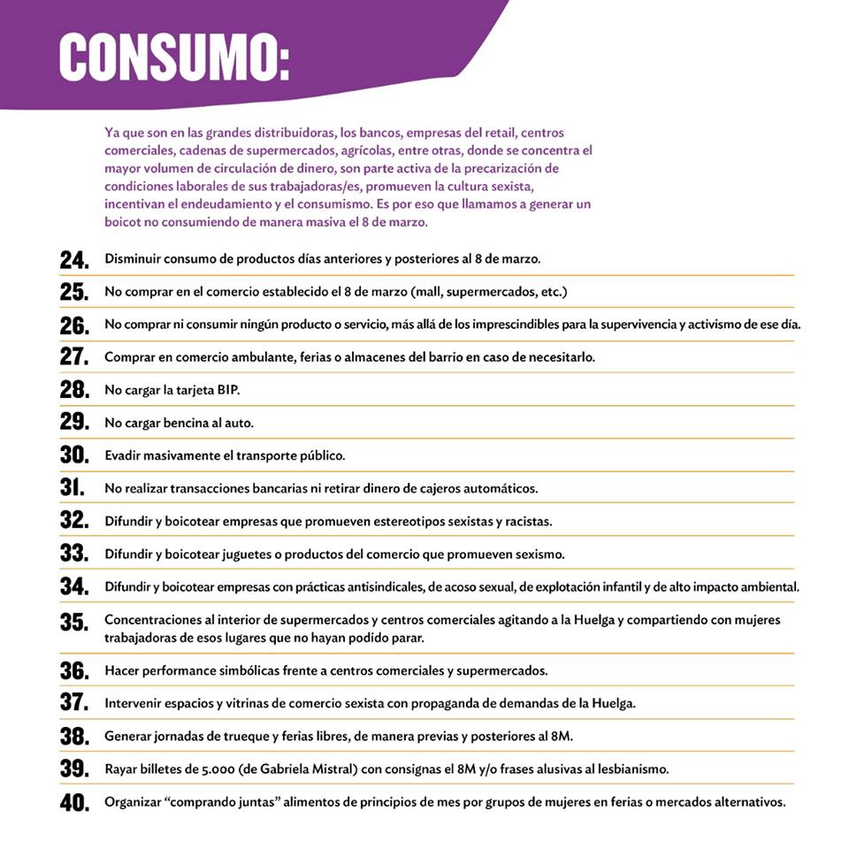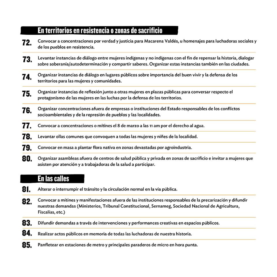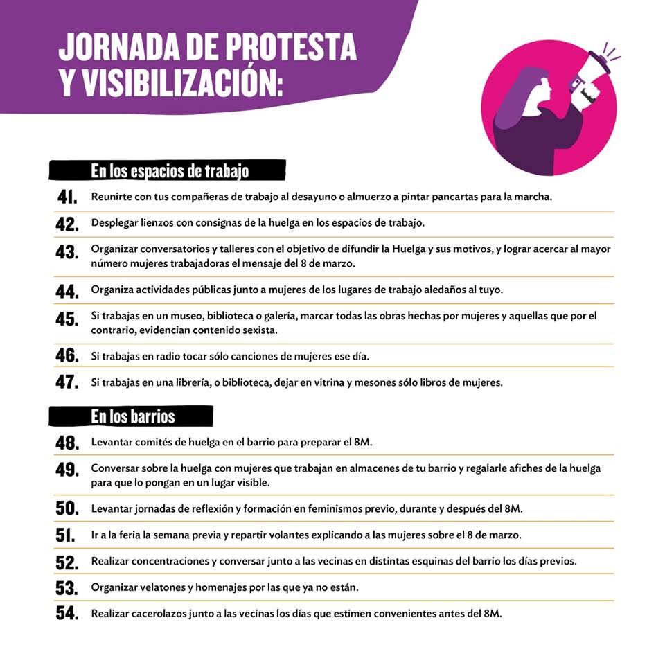 Enumeradas del 1 hasta el 121, la organización propone distintas alternativas para visibilizar el apoyo al movimiento feminista actual. Desde generar instancias de conversación en espacios públicos, laborales y del hogar, hasta lucir una cinta violeta en la muñeca, sumarse al cacelorazo del 7 de marzo a las 21 hrs., y encargar a los hombres de familia las tareas del hogar para el 8M.