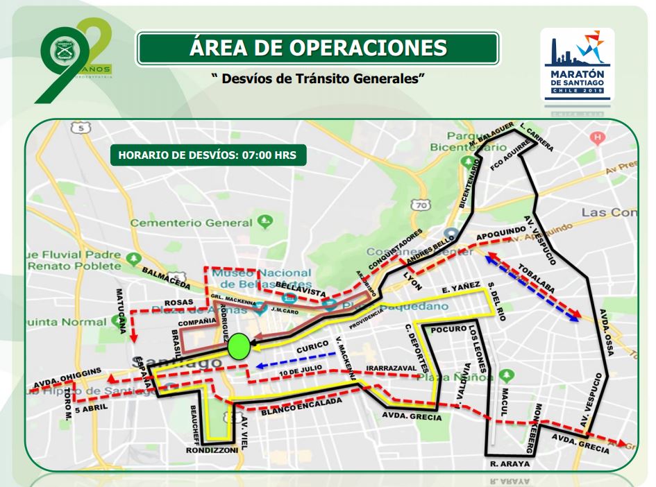 Carabineros publicó un mapa con los distintos desvíos de tránsito que habrá por la maratón.