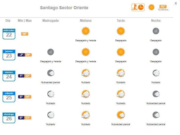 En Santiago se espera que la zona cordillerana mañana amanezca con -2°C y que durante el día se llegue a una máxima de 20°C. Ya para el fin de semana, las temperaturas más bajas se acercarán a los 10°C.