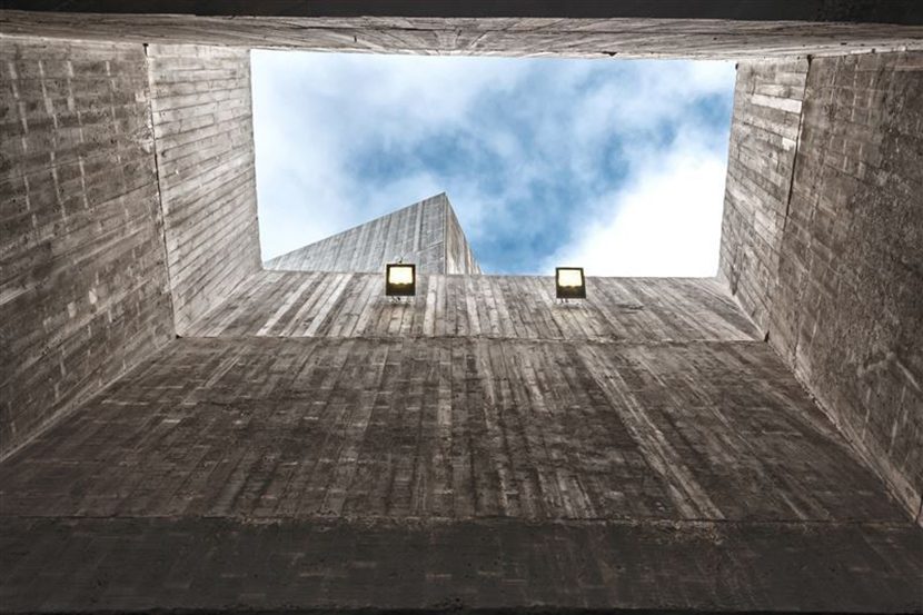 La vivienda tiene tres grandes cuerpos de hormigón que se apoyan entre sí. En el de la parte inferior y horizontal está la sala de estar y el comedor, con ventanas que permiten una panorámica completa del mar. En el bloque vertical están los dormitorios y baño.