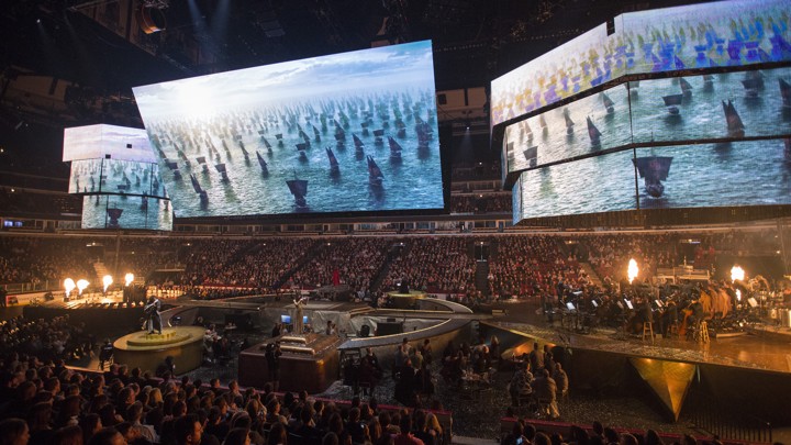 Además, de la música y coros, el espectáculo, contará con cuadros de danza con bailarines personificando a los protagonistas de la serie, así como efectos de luz, humo, fuego, entre otros. La pantalla tendrá dimensiones de 7 por 4 metros, que asegura excelente visibilidad a todos los asistentes.