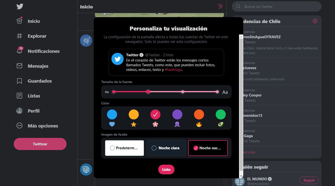 En el intento de la red social por hacerla una plataforma más personalizada, la nueva versión de Twitter permite cambiar los colores de los botones y los links. El clásico celeste puede ser cambiado a otros colores como verde, naranjo o rosado.