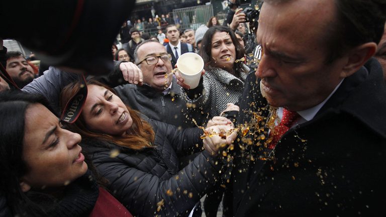 En una manifestación a las fuera del recinto educacional, Diego Schalper (RN), Jaime Bellolio (UDI), Luis Pardo (RN), Sebastian Torrealba (RN) y María José Hoffmann (UDI) fueron recibidos con escupos y les lanzaron café.