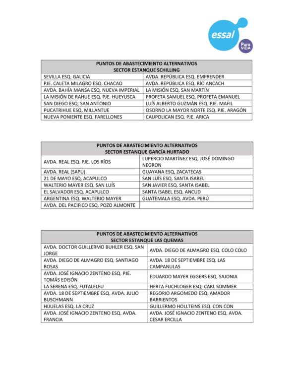 Entre las 6:00 y las 8:00 horas de esta mañana la empresa entregó 2 horas de abastecimiento de agua e informó que durante el día se mantendrán los puntos alternativos de suministro. Sin embargo, los vecinos han denunciado que los estanques dispuestos están vacíos o no son suficientes para abastecer a todos ya que su capacidad máxima es de aproximadamente 500 litros.