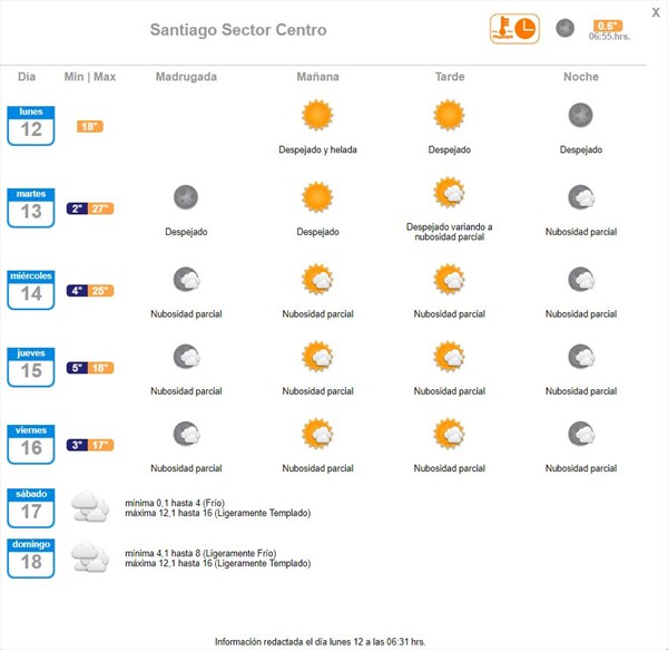 Para este lunes, la región Metropolitana se espera una máxima de 18 grados, a pesar de que a las 7:00 horas de esta mañana los termómetros solo marcaron 0.6°C.